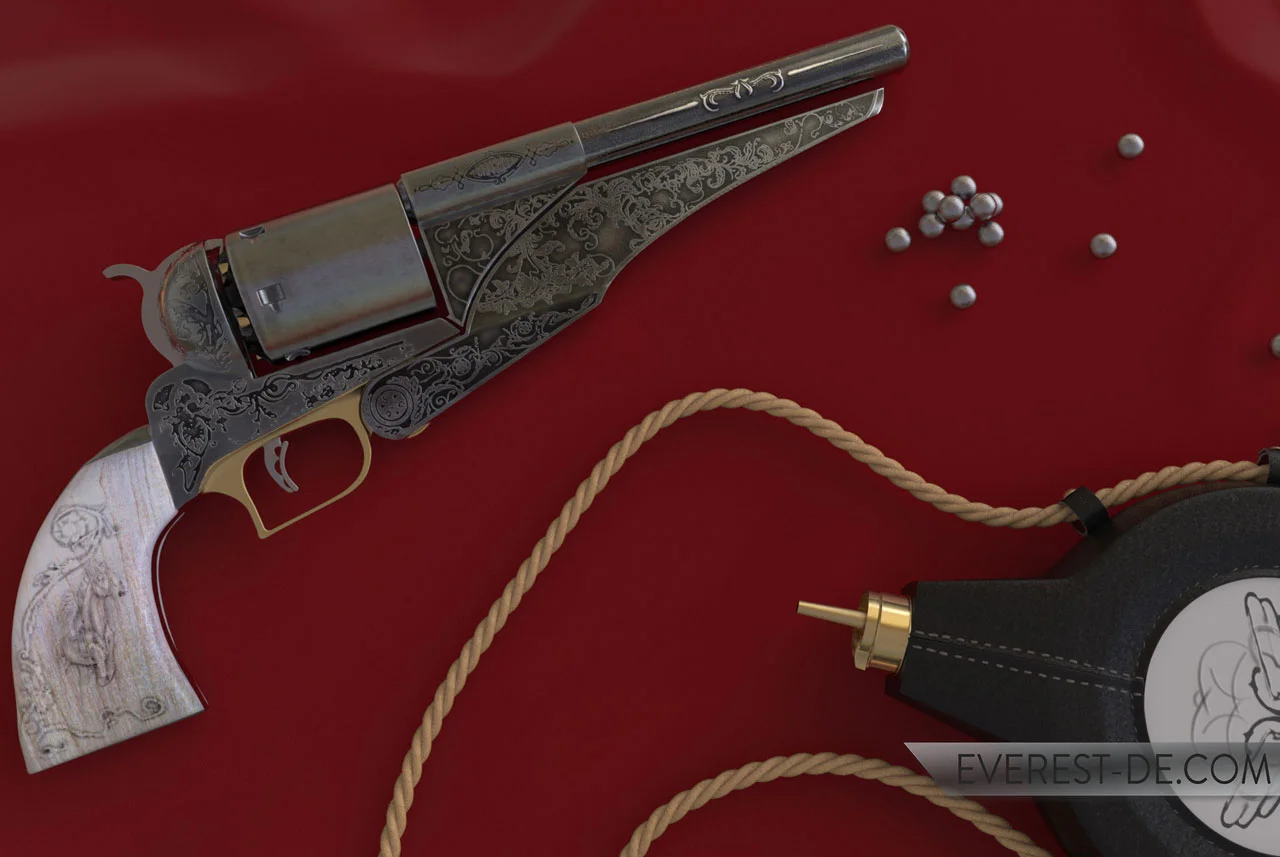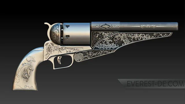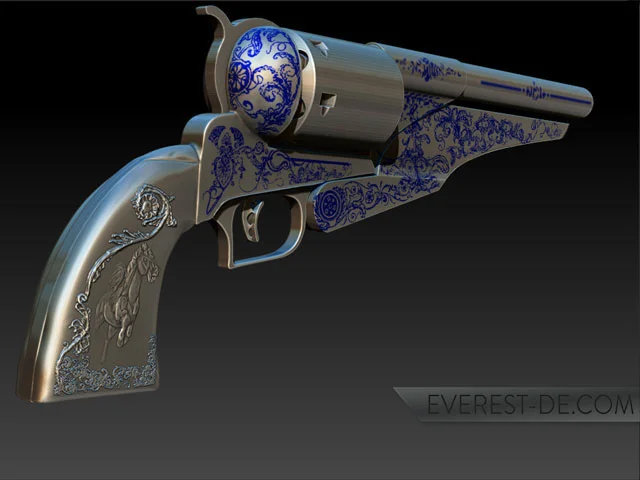 The Revolver. Inspired by the 1860 Colt Navy, I designed my own open bridge revolver.